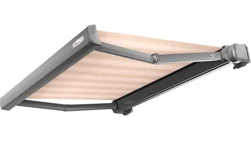 У кассетной локтевой маркизы механизм открывания полностью закрыт, что позволяет устанавливать изделие под открытым небом. Электропривод системы управляется бесшумно и автоматически.
