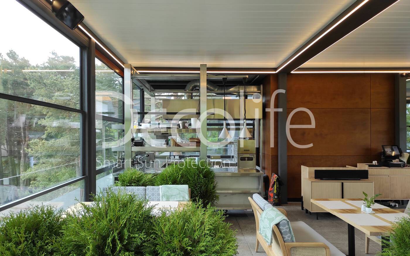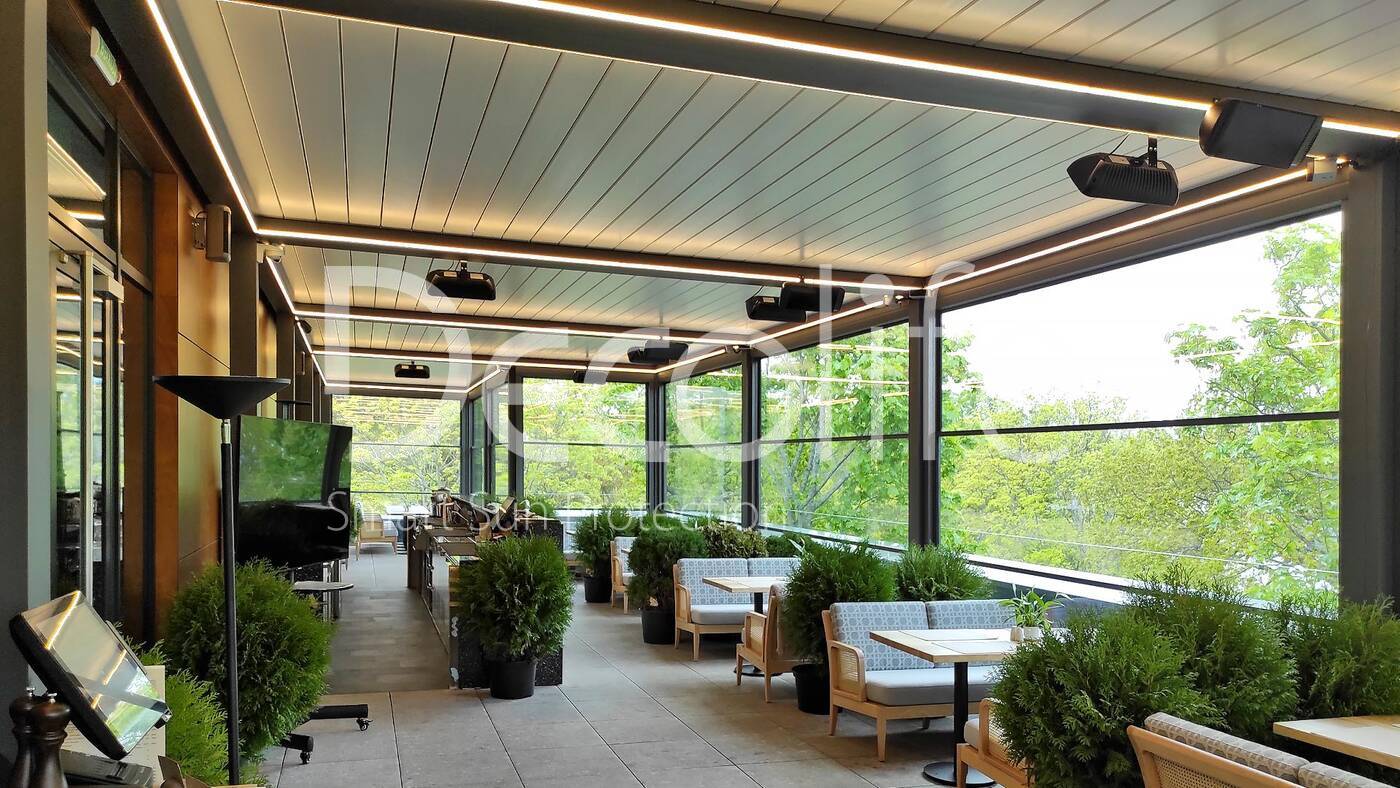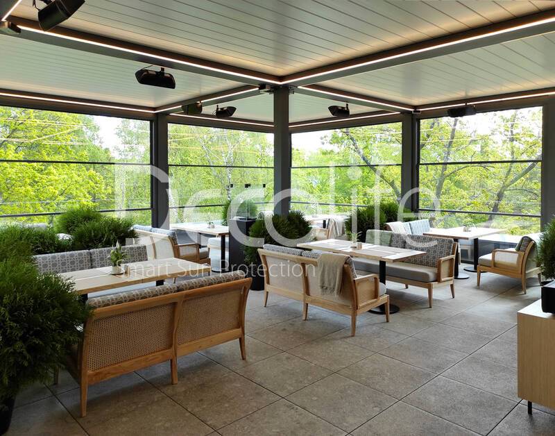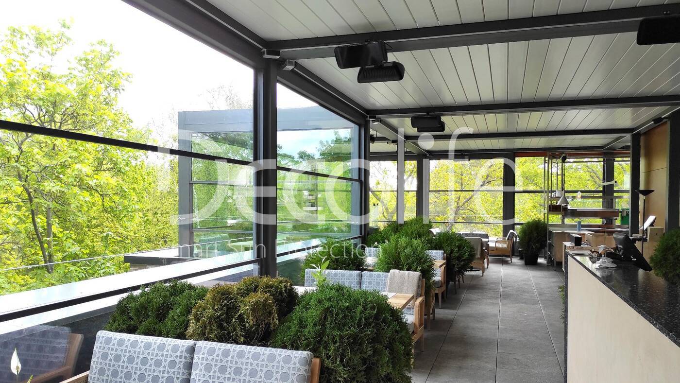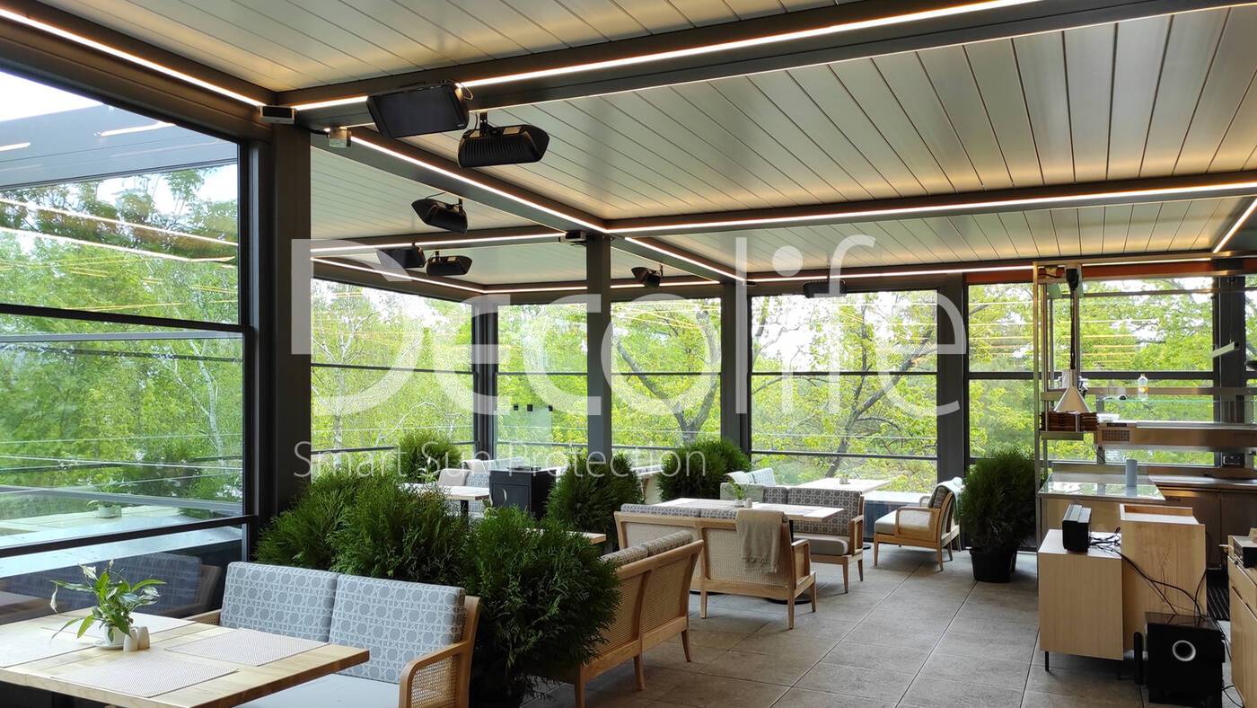 Пергола биоклиматическая Decolife B500-20П + Гильотинное остекление W500 купить для кафе и ресторана