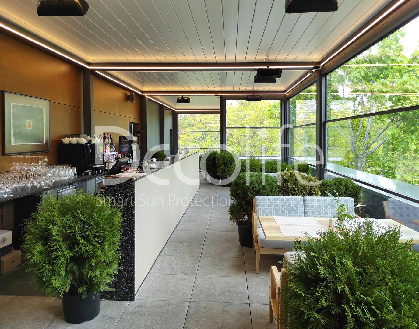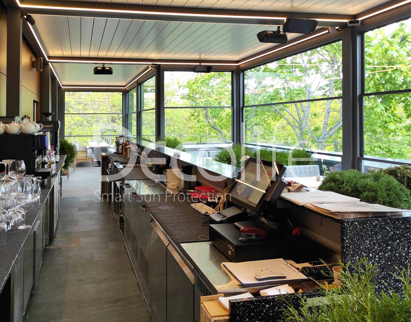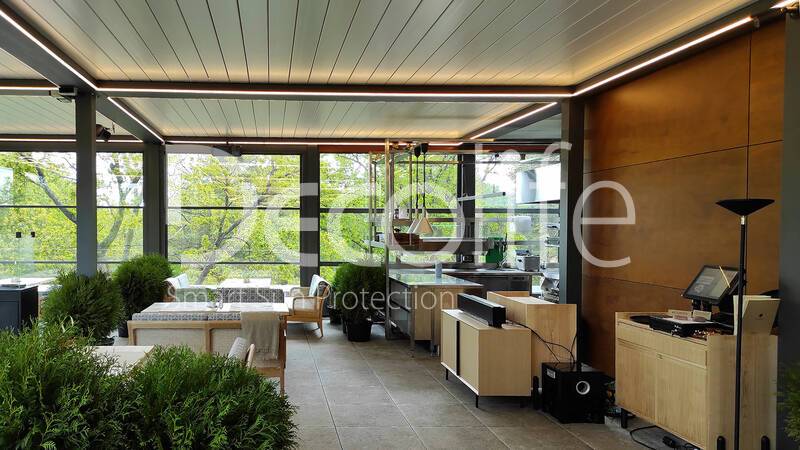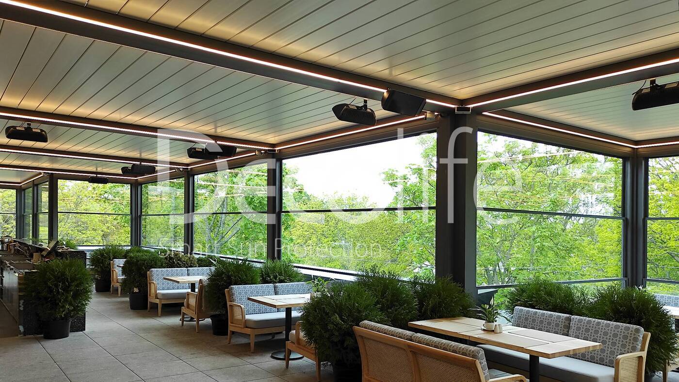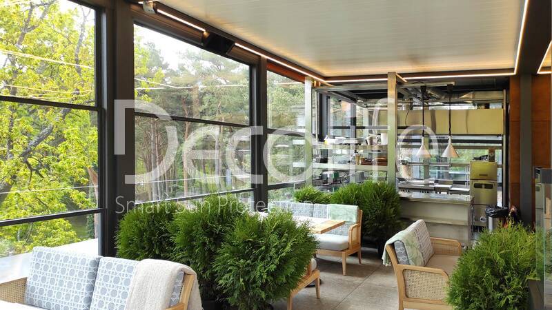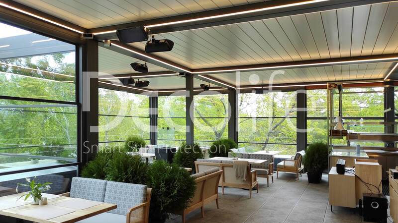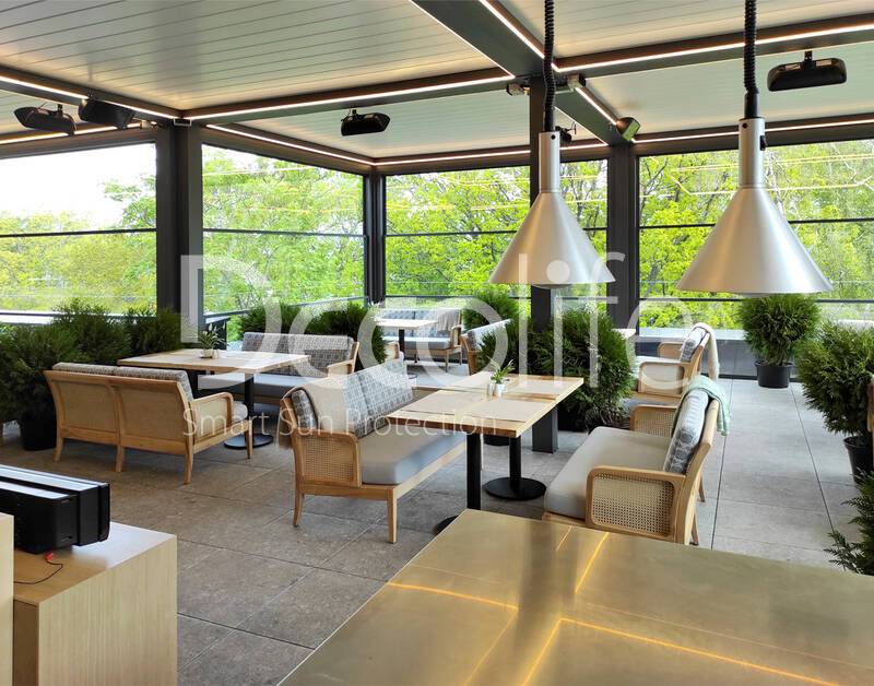 Пергола биоклиматическая Decolife B500-20П + Гильотинное остекление W500 купить для кафе и ресторана