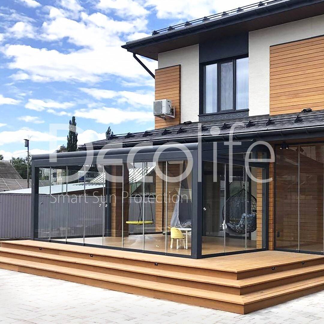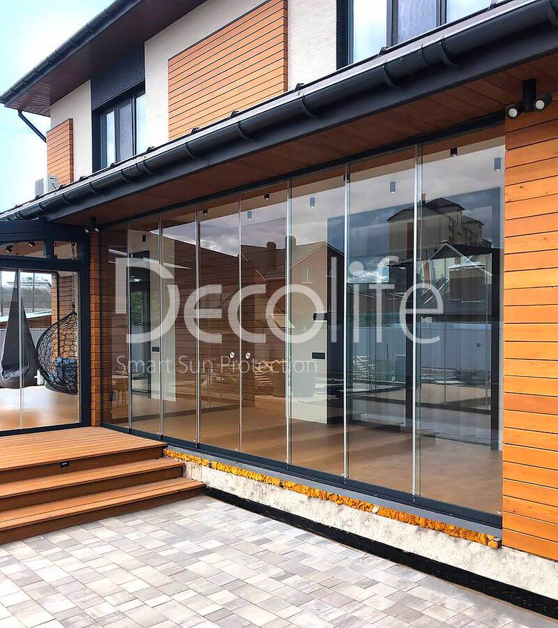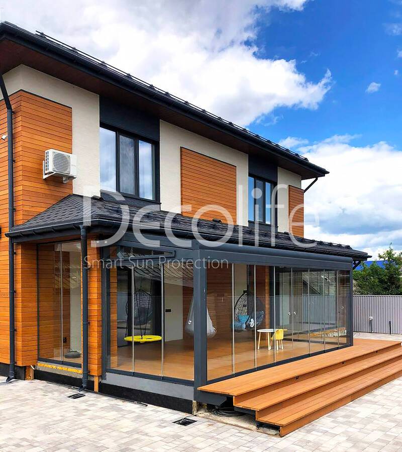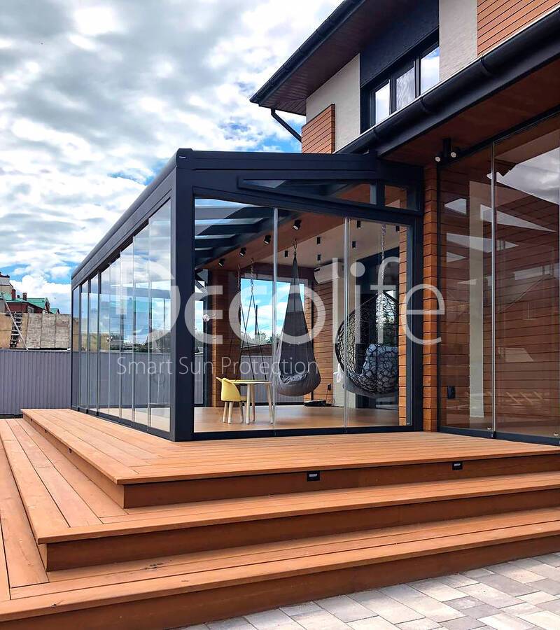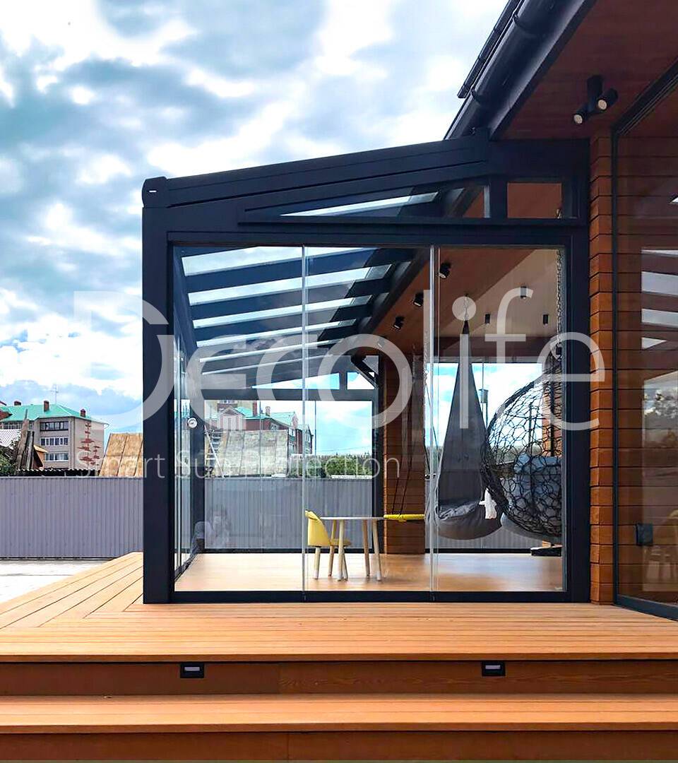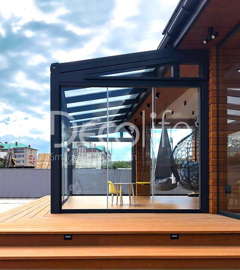 Безрамное раздвижное остекление и раздвижные конструкции в сочетании с раздвижными окнами и дверями стеклопакет создают революционный дизайн. Это позволяет придать перголе особый шарм, преобразуя пространство в удивительно уютное место для отдыха.
