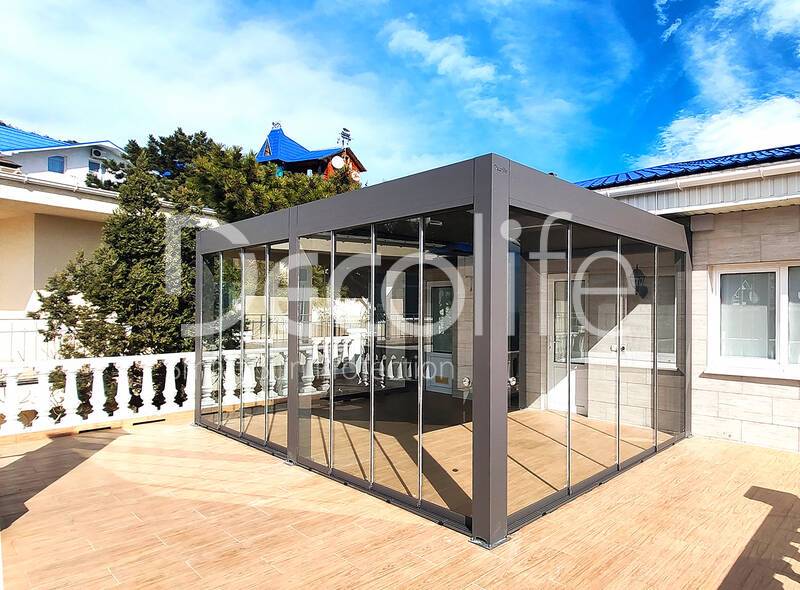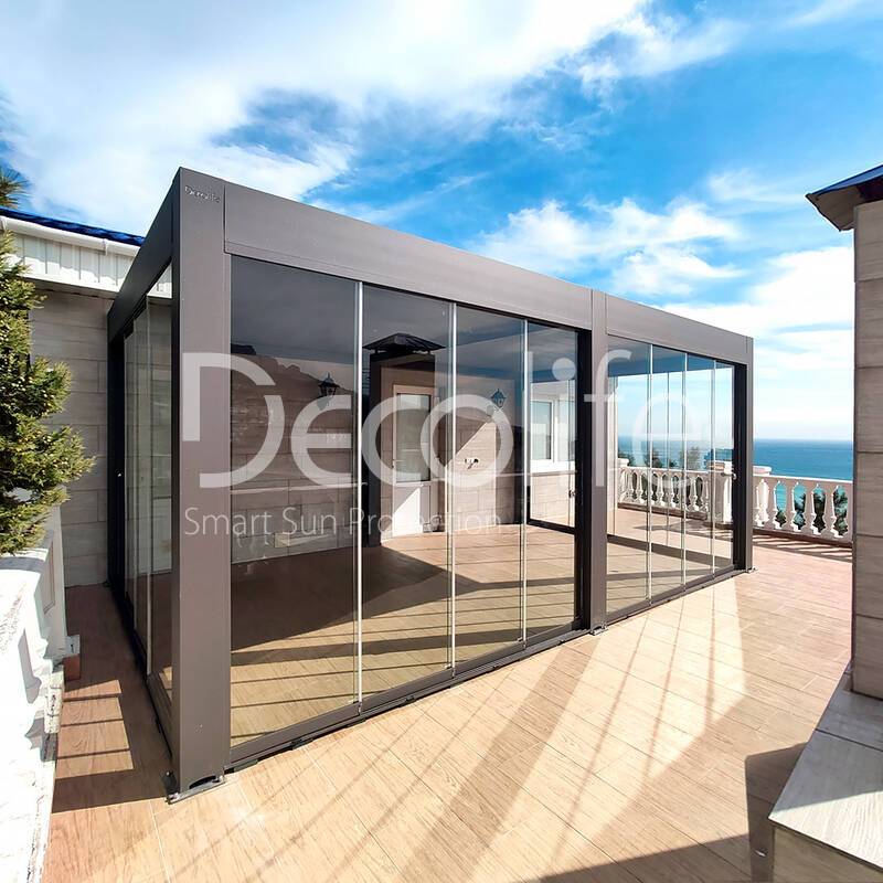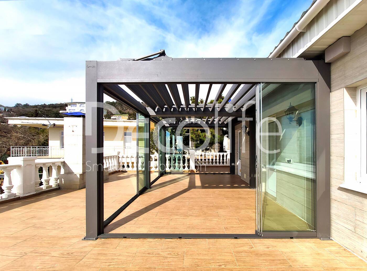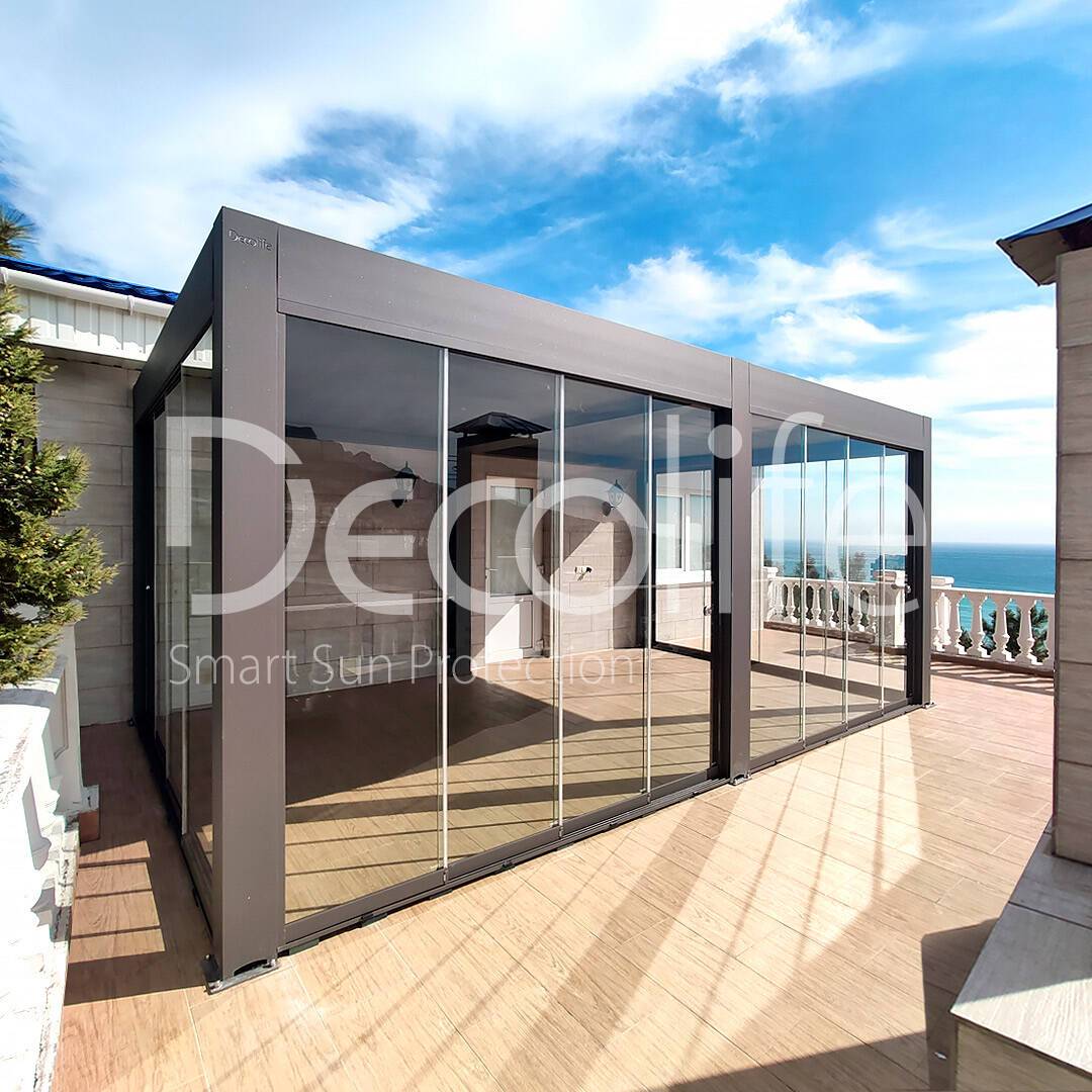 Пергола биоклиматическая Decolife B500-25П + Безрамное остекление S100 купить для террасы, дачи, пристроенная к дому