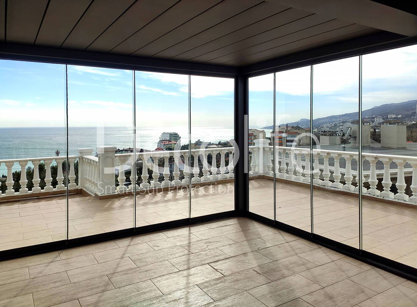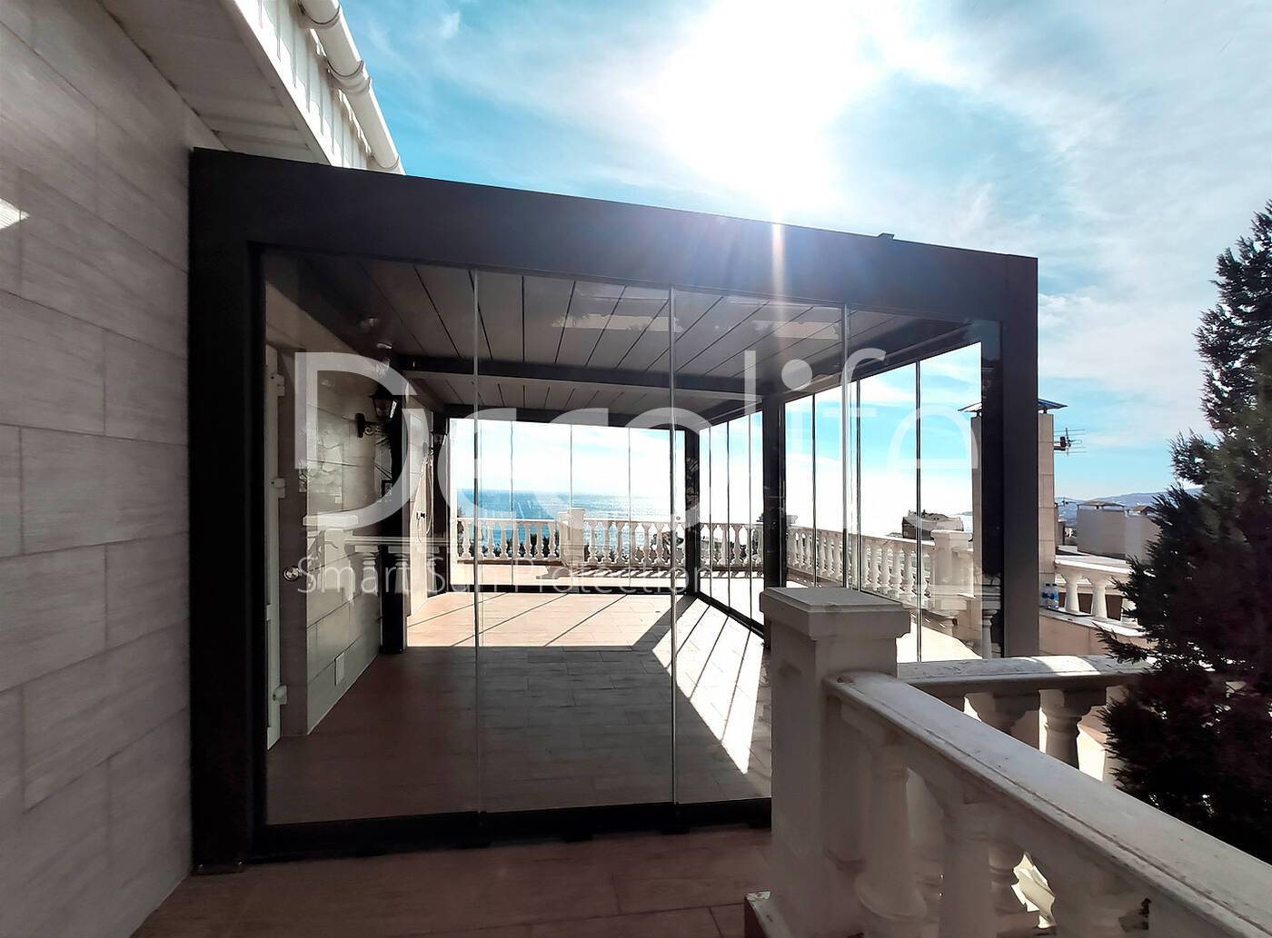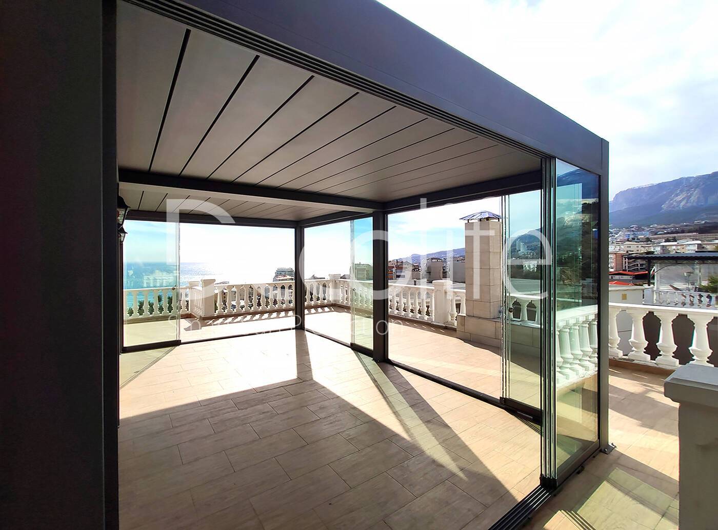Пергола биоклиматическая Decolife B500-25П + Безрамное остекление S100 купить для террасы, дачи, пристроенная к дому