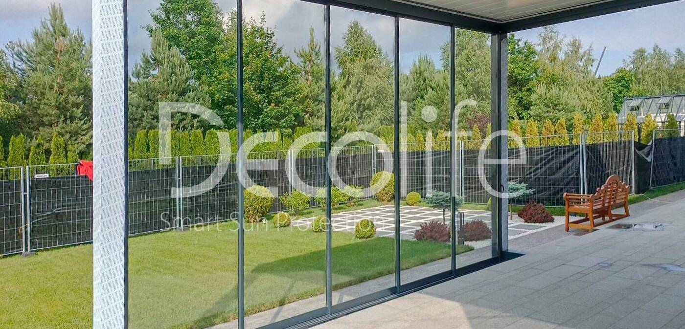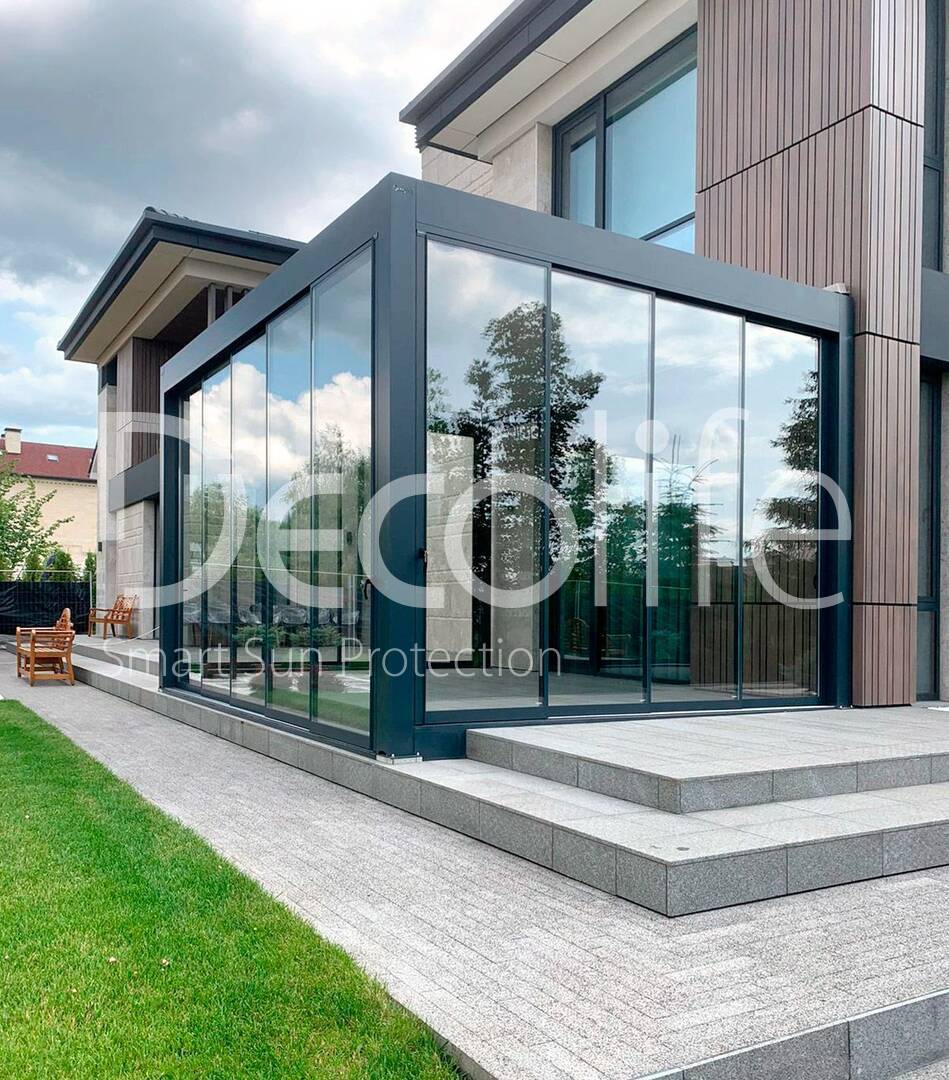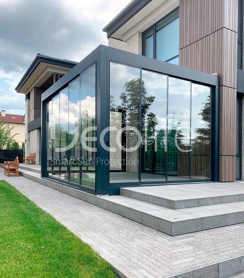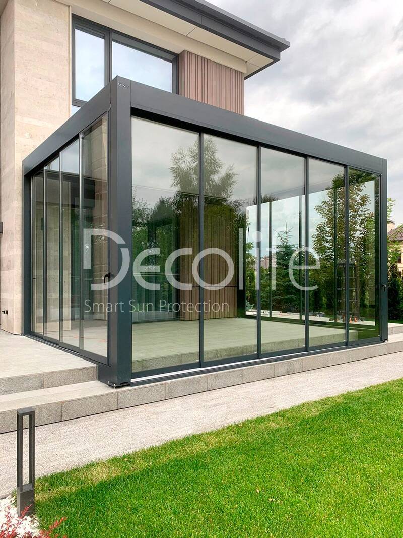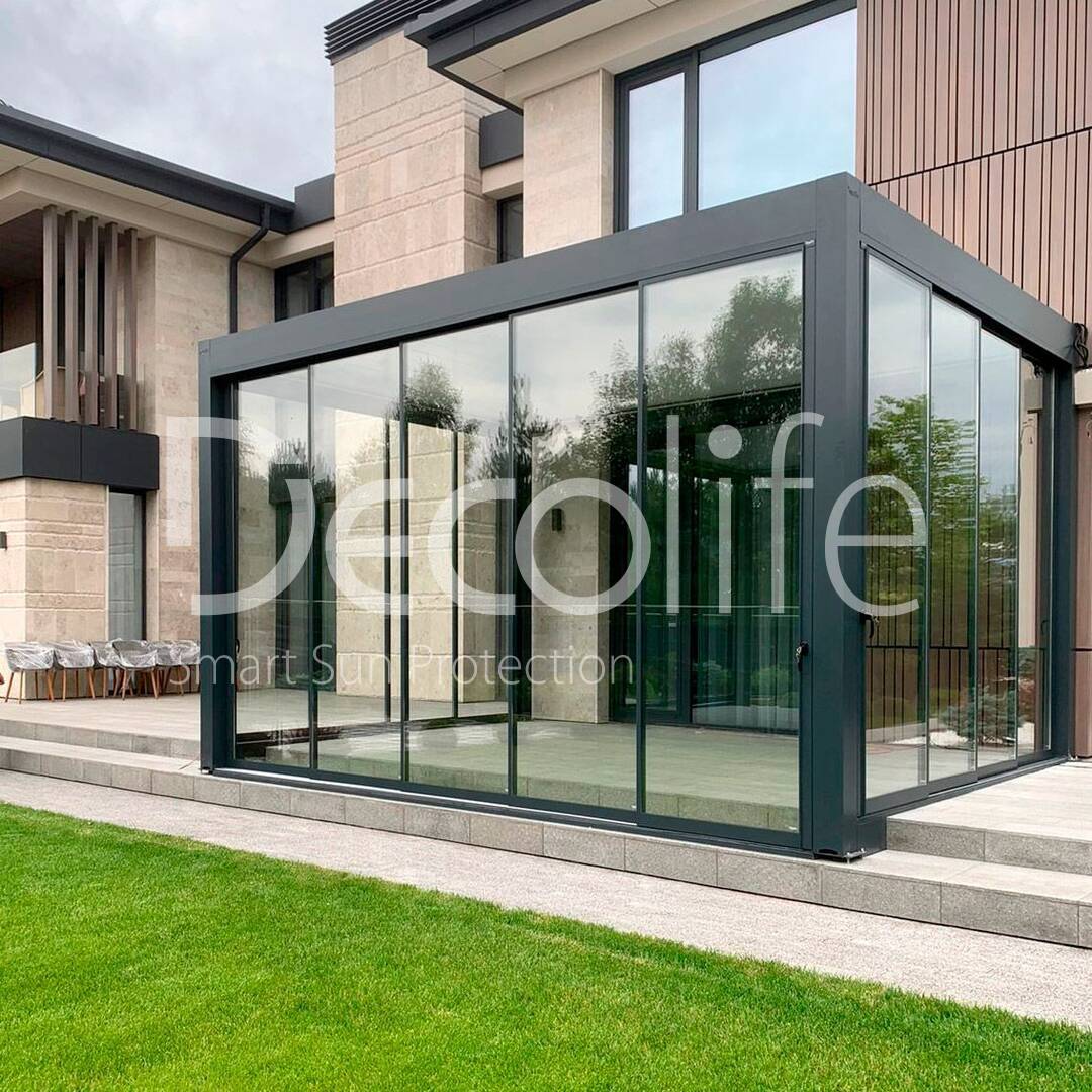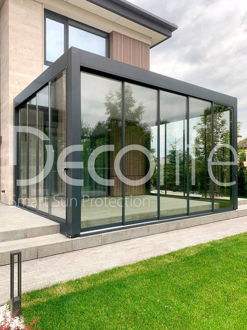Пергола Decolife Bioclimatic B700-20C + Раздвижное остекление S500 купить для террасы, дачи, пристроенная к дому