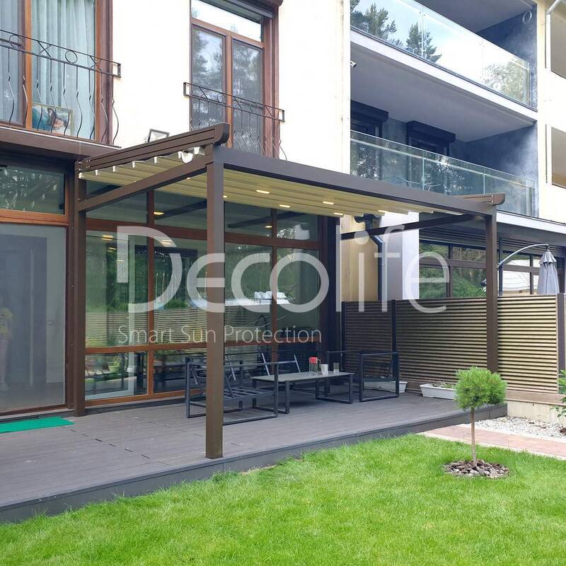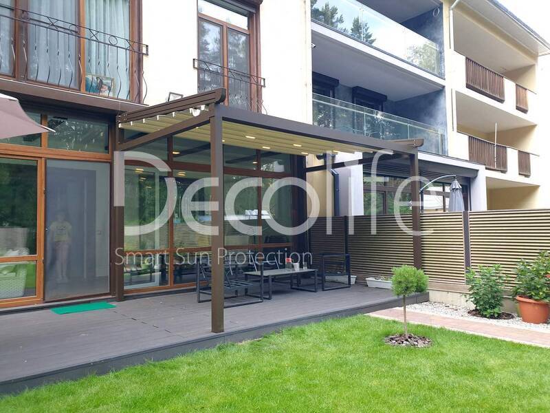 Изысканный дизайн перголы, обрамленной витиеватыми завитками, словно создан для того, чтобы окутать этот уголок в роскошный покров. Zip система, скрытая от взора, совершенно идеально интегрируется в архитектуру, делая перголу поистине хрустальной по своей прозрачности и изяществу.