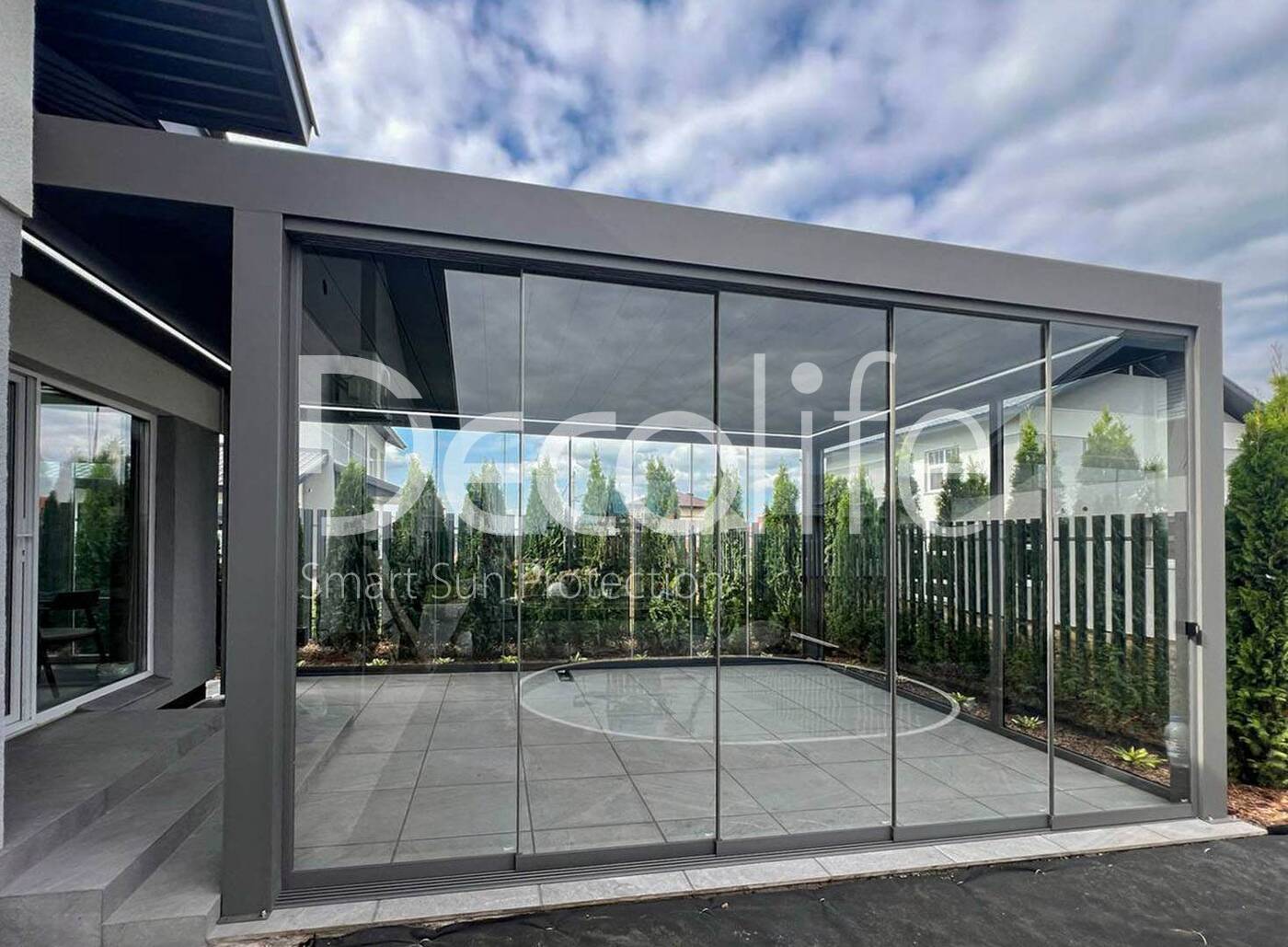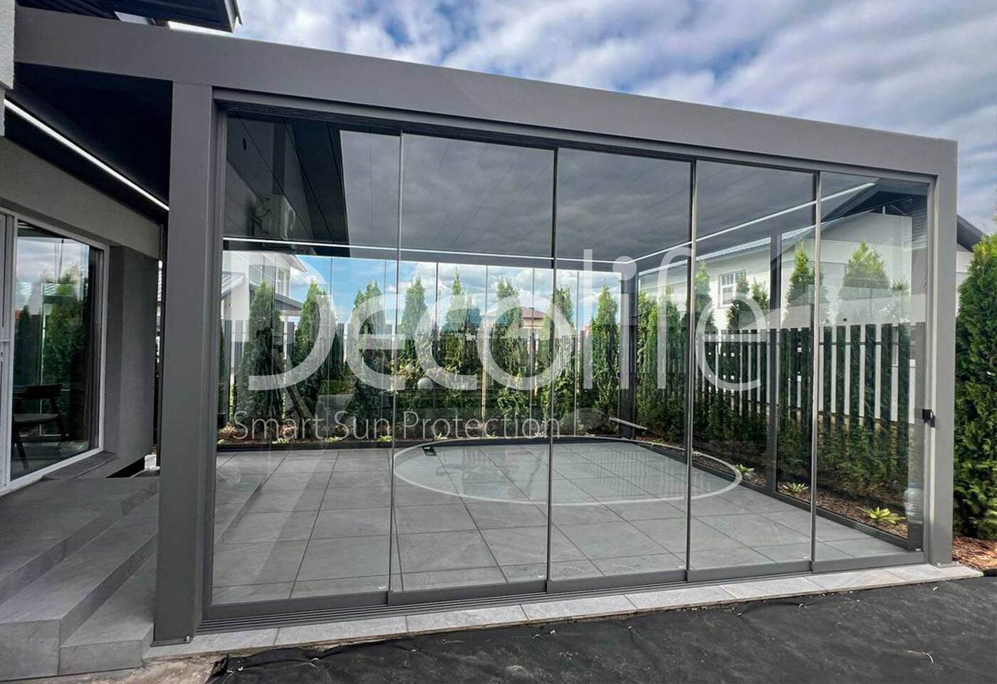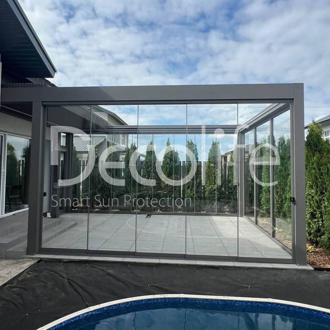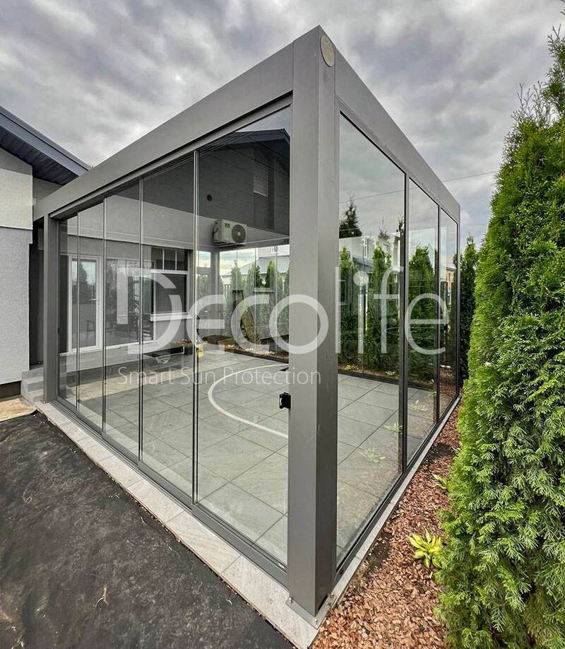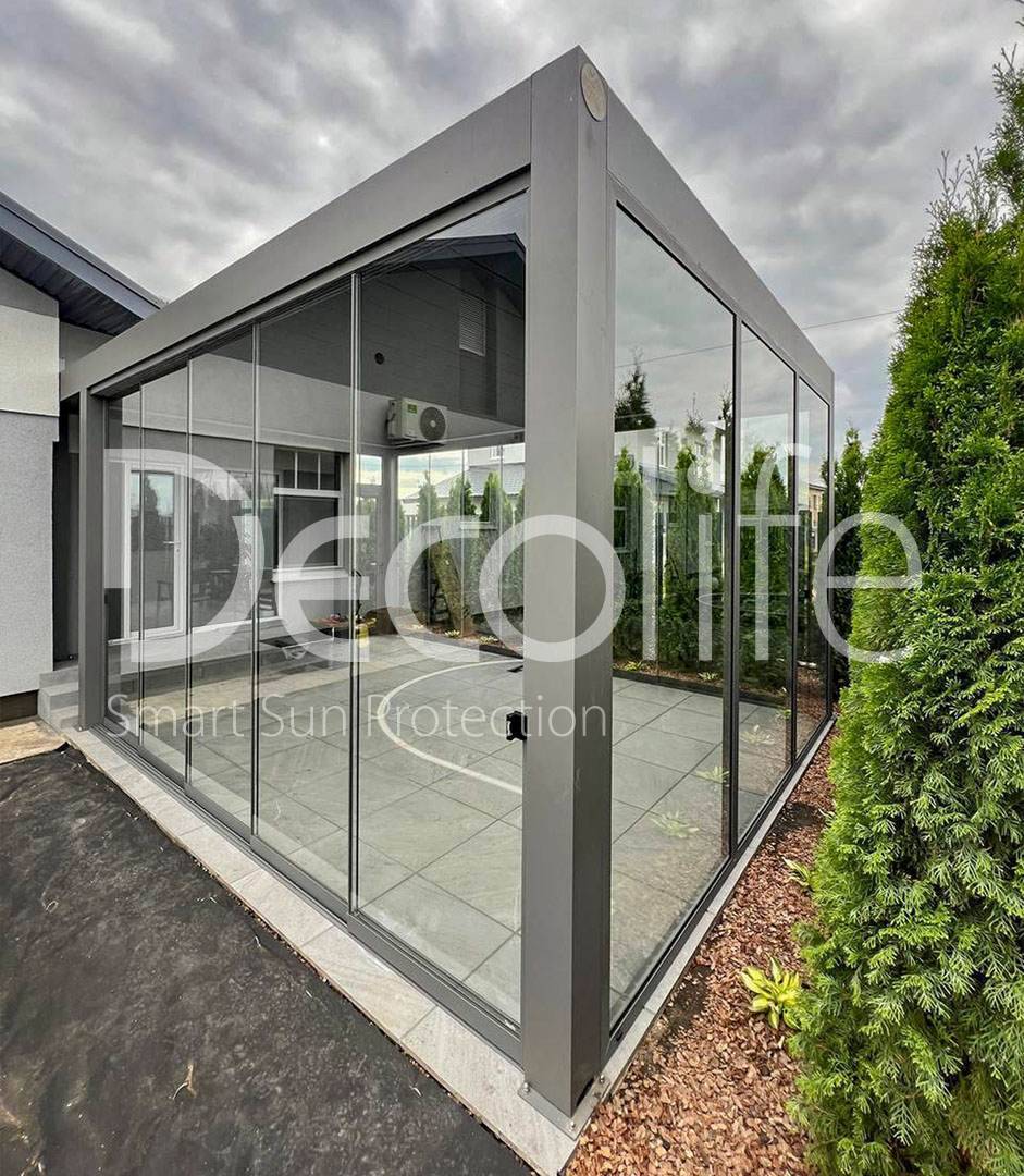 Пергола Decolife B700-25С + раздвижное остекление S200 + входная двери и глухое остекление FW84, объект реализован партнером @markizaqueen купить для террасы, дачи, пристроенная к дому