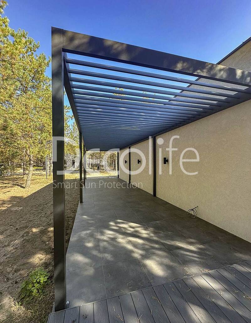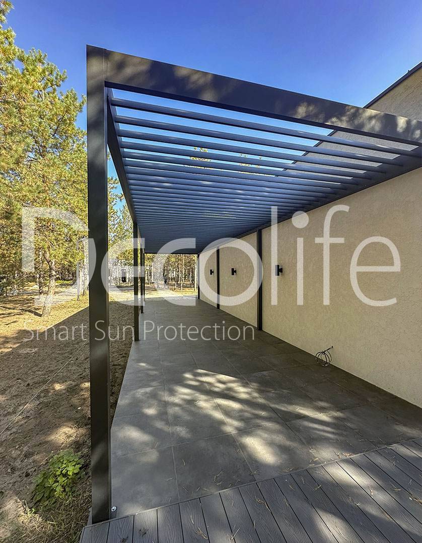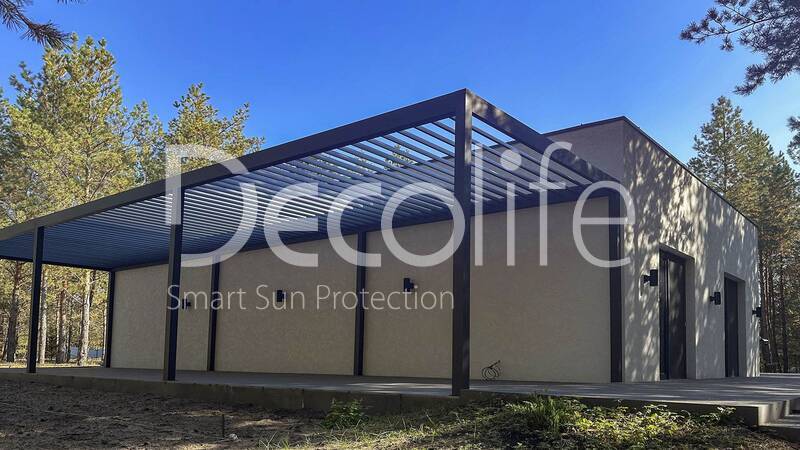Пергола Decolife со статичными ламелями В200 MAF + Bioclimatic B500-20П, объект реализован партнером "Территория комфорта" купить для террасы, дачи, пристроенная к дому