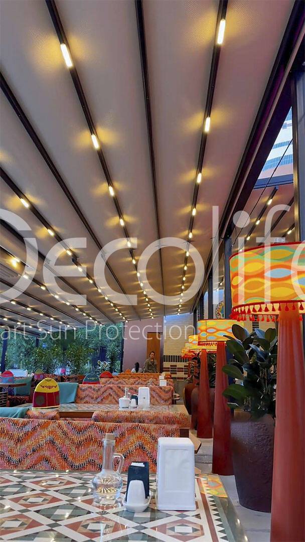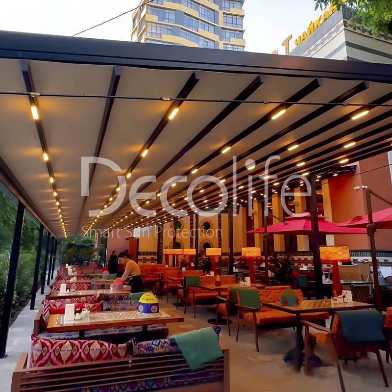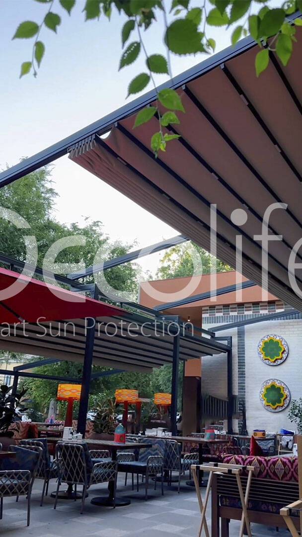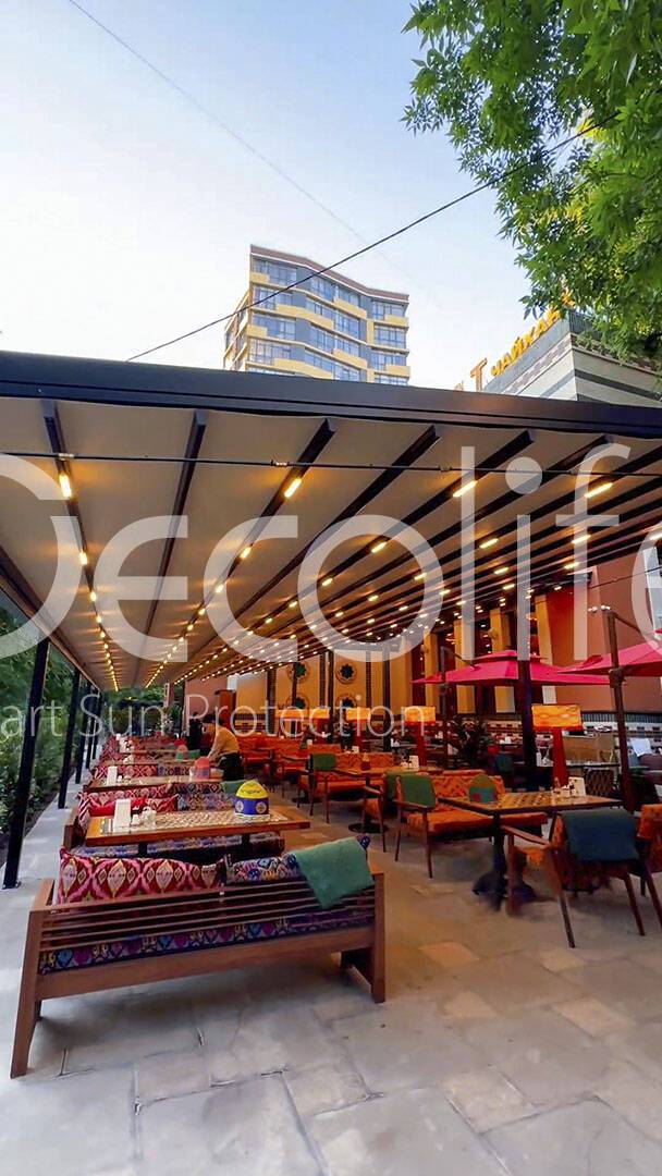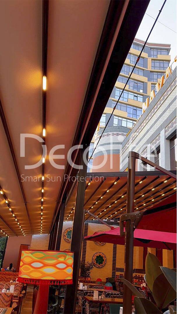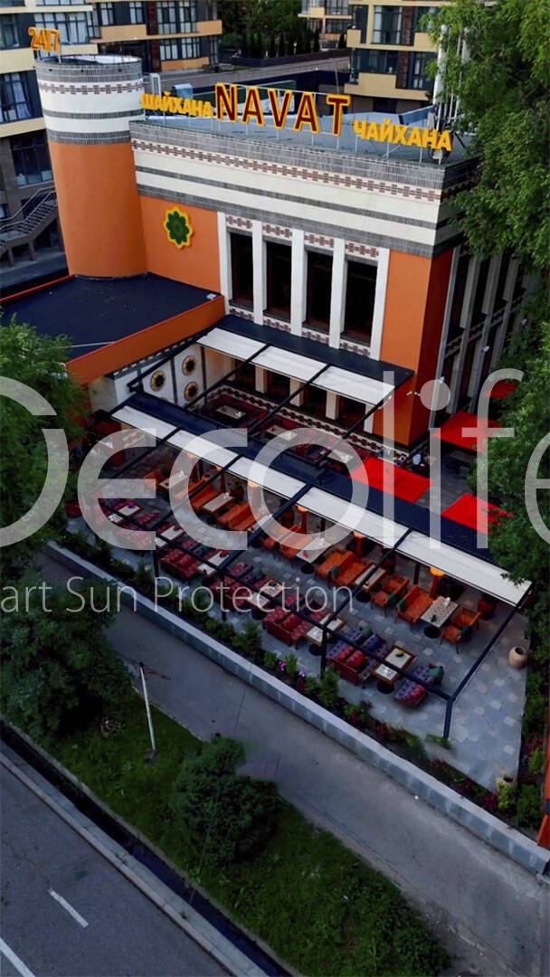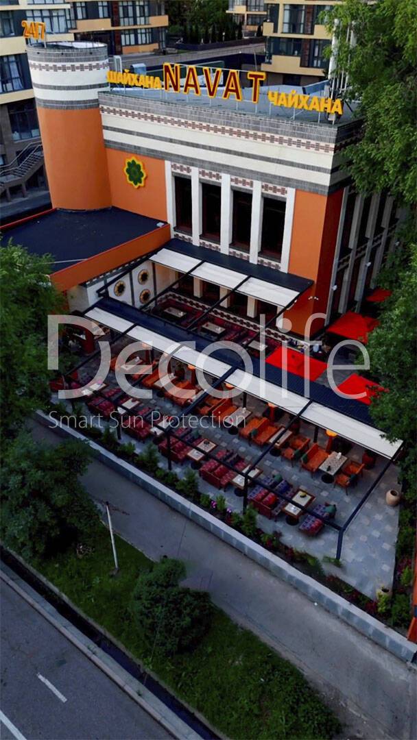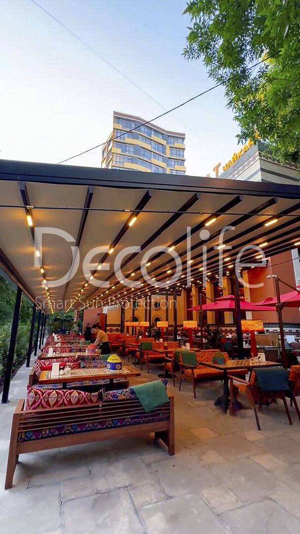 Тентовые перголы Decolife Project Light, объект реализован партнером "TENT VERTEX" купить для кафе и ресторана