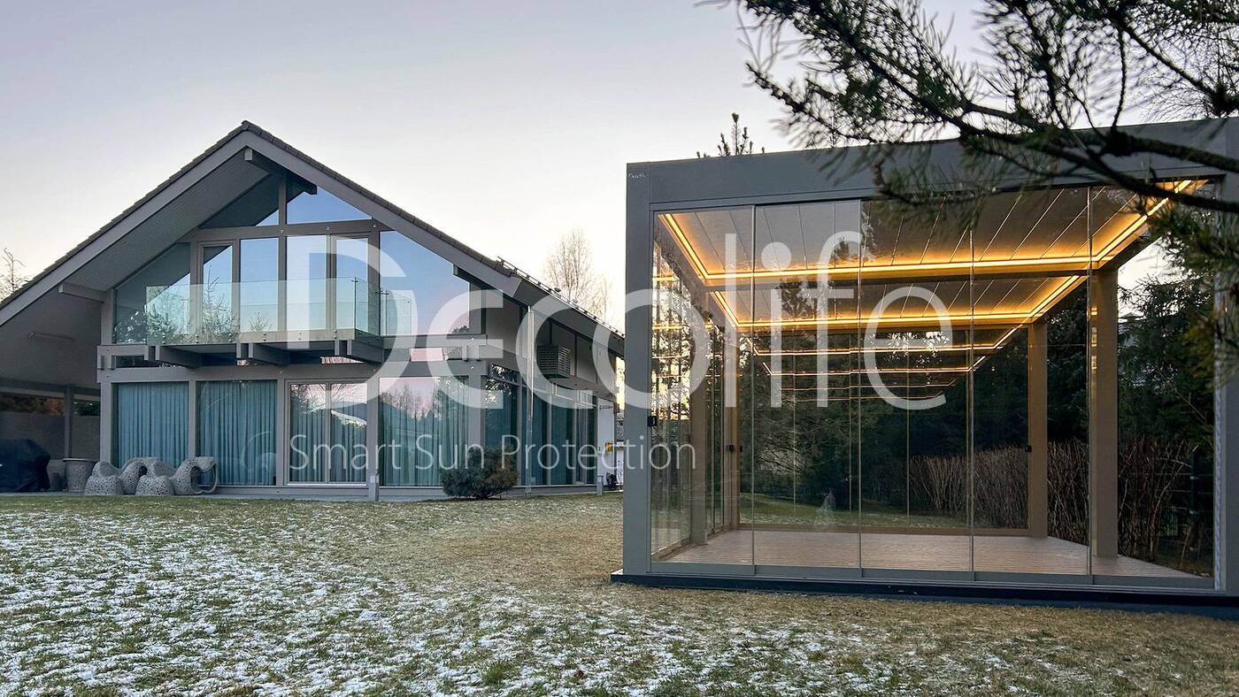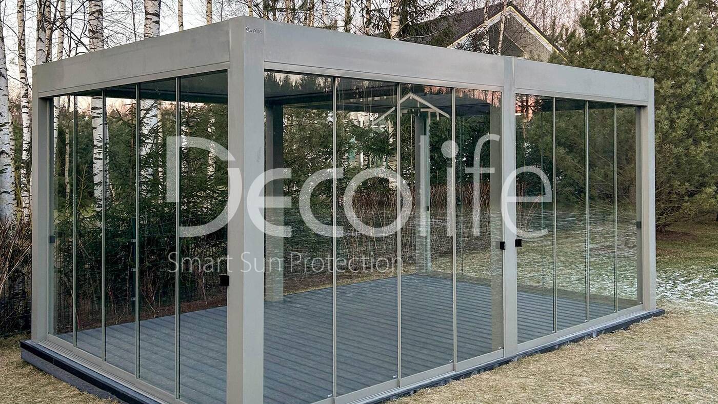 Пергола Decolife Bioclimatic B700 + Раздвижное остекление S200 купить для террасы, дачи, пристроенная к дому